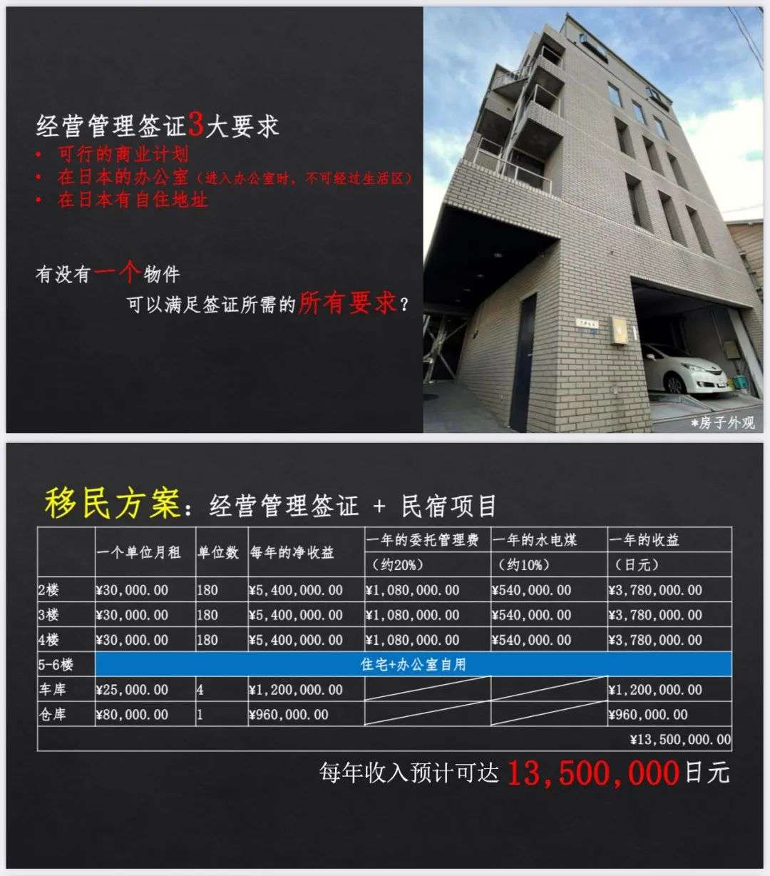 经营管理签证的要求正是设立公司运营可持续发展的事业项目,所以郑伊健夫妇就是典型的“设立日本公司-购买房产-申请经营管理签证”的案例,这也就说明了通过合理的事业计划,是可以实现买房来办理经营管理签证。